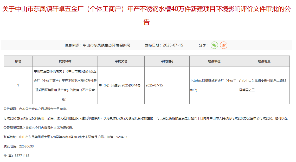 2025年7月15日,中山市東鳳鎮(zhèn)生態(tài)環(huán)境保護(hù)局就中山市東鳳鎮(zhèn)軒卓五金廠(個(gè)體工商戶)年產(chǎn)不銹鋼水槽40萬件新建項(xiàng)目環(huán)境影響評(píng)價(jià)文件作出審批意見并對(duì)外進(jìn)行公告,公告期限:自本公告發(fā)布之日起滿六十日屆滿。