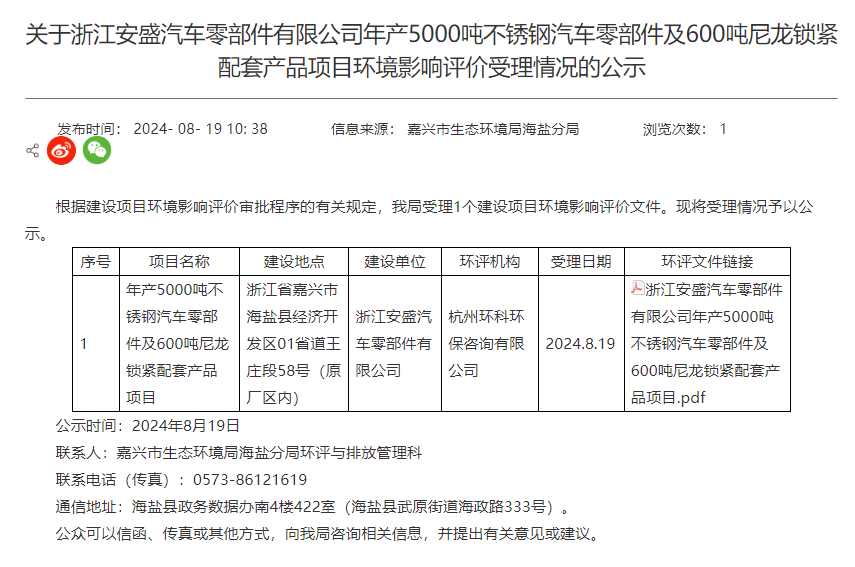 8月19日,嘉興市生態環境局海鹽分局受理浙江安盛汽車零部件有限公司年產5000噸不銹鋼汽車零部件及600噸尼龍鎖緊配套產品項目環境影響評價報告表并對外進行公示。